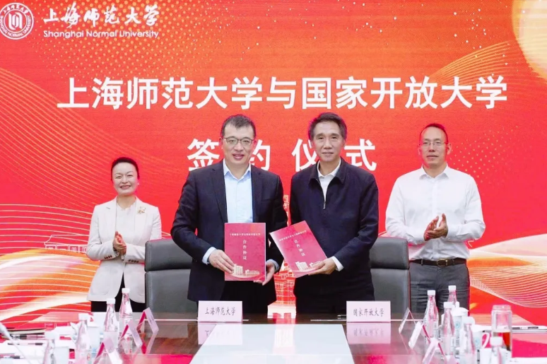 Shanghai, 13 April 2026 - The Signing Ceremony for the strategic cooperation agreement between the Open University of China (OUC) and Shanghai Normal University was held at Shanghai Normal University (SHNU). OUC President Dr. WANG Qiming and Vice President LI Song; SHNU President Dr. CHEN Heng, and Dr. YUAN Wen, former President of SHNU and Dean of its Research Institute for Lifelong Learning and Sustainable Development; Dr. MIN Hui, Party Secretary of Shanghai Ocean University; JIA Wei, President of Shanghai Open University; YAN Pengtao, Director of the Lifelong Education Division of Shanghai Municipal Education Commission; and heads of relevant departments attended the event. The Signing Ceremony was chaired by SHNU Vice President Dr. YANG Haiyan.